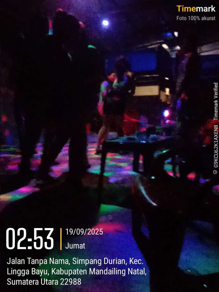 Mandailing Natal, tabagsel.redaksisatu.id – Cuplikan video berdurasi 00:40 detik diambil pada tanggal 19/09/25 pukul 02:56 WIB dini hari tentang sebuah pertunjukan ala club malam dimana cafe jengkol secara remang-remang diantara gemerlapnya lampu disco dan suara musik yang cukup keras terlihat beberapa wanita dikelilingi pria sambil berjoget bersama dengan gaya masing-masing, dalam pikiran kita sudah jelas “pasti sedang mabuk”.