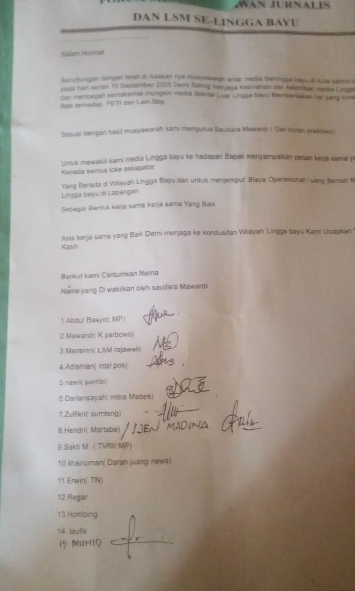 “Sesuai dengan hasil musyawarah kami mengutus saudara Mawardi / dari Koran Prabowo untuk mewakili kami media Lingga Bayu ke hadapan Bapak menyampaikan pesan kerjasama yang baik kepada semua toke eskapator yang berada di Wilayah Lingga Bayu dan untuk menjemput Biaya Operasional / uang Bensin media Lingga Bayu dilapangan sebagai bentuk kerjasama yang baik”, demikian tertuang dalam isi surat yang beredar tersebut.