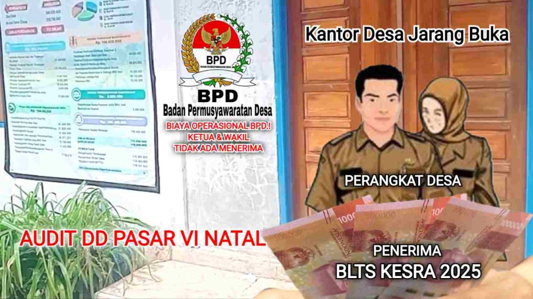 Mandailing Natal, tabagsel.redaksisatu.id – Dana Bantuan Langsung Tunai Sementara (BLTS) Kesra untuk Desa Pasar VI Kecamatan Natal, Kabupaten Mandailing Natal, Sumatera Utara diduga tidak tepat sasaran sesuai aturan persyaratan penerima yang telah ditentukan. Bahkan, sebagian insentif dari Dana Desa (DD) tahun 2025 (Informasi sumber_red) hingga berita ini diterbitkan belum juga dibayarkan oleh Kepala Desa setempat.