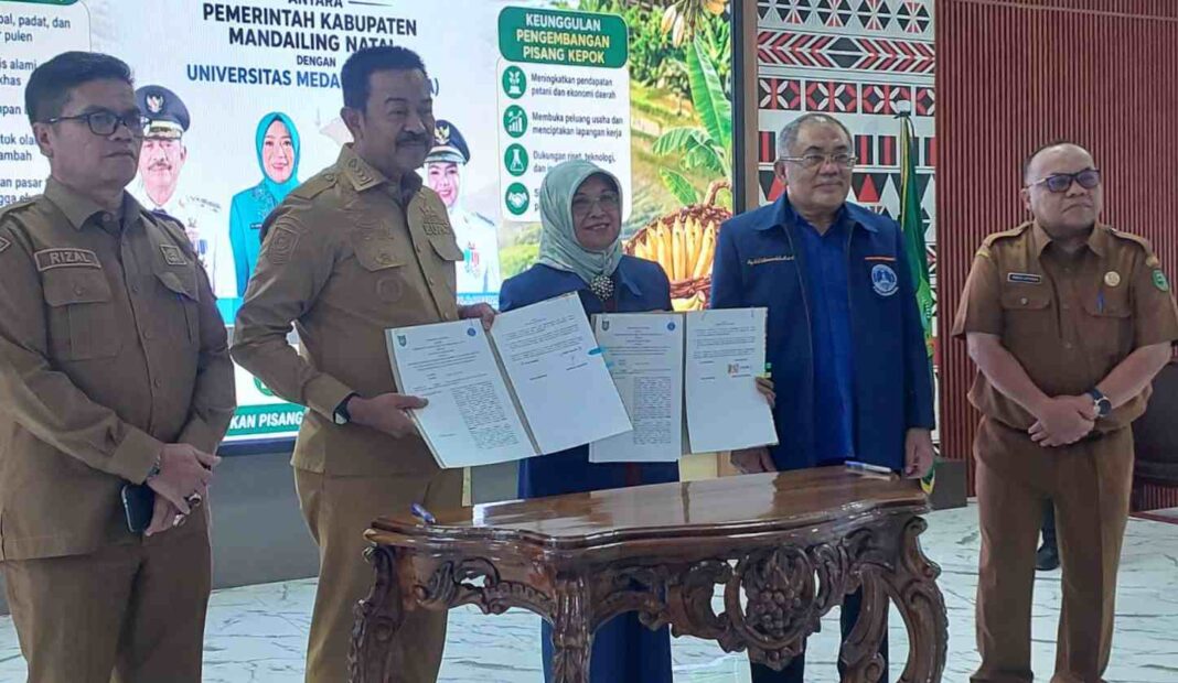 Mandailing Natal, tabagsel.redaksisatu.id – Bupati Mandailing Natal, Saipullah Nasution teken kerjasama MoU dengan Universitas Medan Area (UMA), untuk pengembangan budidaya komoditas Pisang Kepok dalam bahasa daerahnya yaitu Pisang “Sitabar”